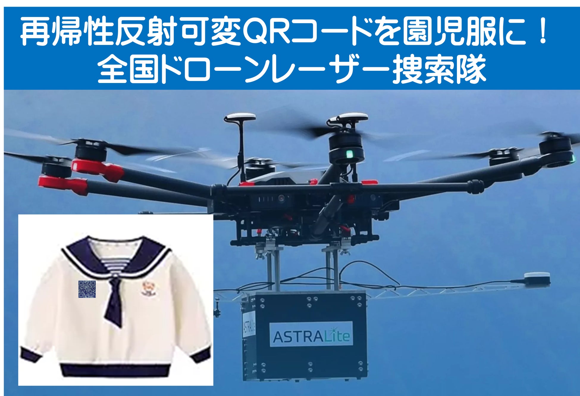 【NPO法人光探索協会】(大阪市、理事長:前田佳伸)は、東日本幹事企業のAPEX株式会社(東京都、代表:下戸優輔)および西日本幹事企業のSMGコンサルタント株式会社(山口市、代表:岡村文義)と協同して「全国ドローンレーザー捜索隊」を組織しました。「再帰性反射可変QRコード」を園児服に装着しておけば、南海トラフ大震災の津波や屋外キャンプなどの迷子時にレーザー捜索が可能になります。万一に備えて「再帰性反射可変QRコード」を園児服に簡単に装着できるように、「再帰性反射アイロンプリント」の無料講習会を令和7年11月13日(木)16時半~当光探索協会の事務所で開催致します。どなたでも参加できますので、ご希望の服をご持参の上ご参加ください。