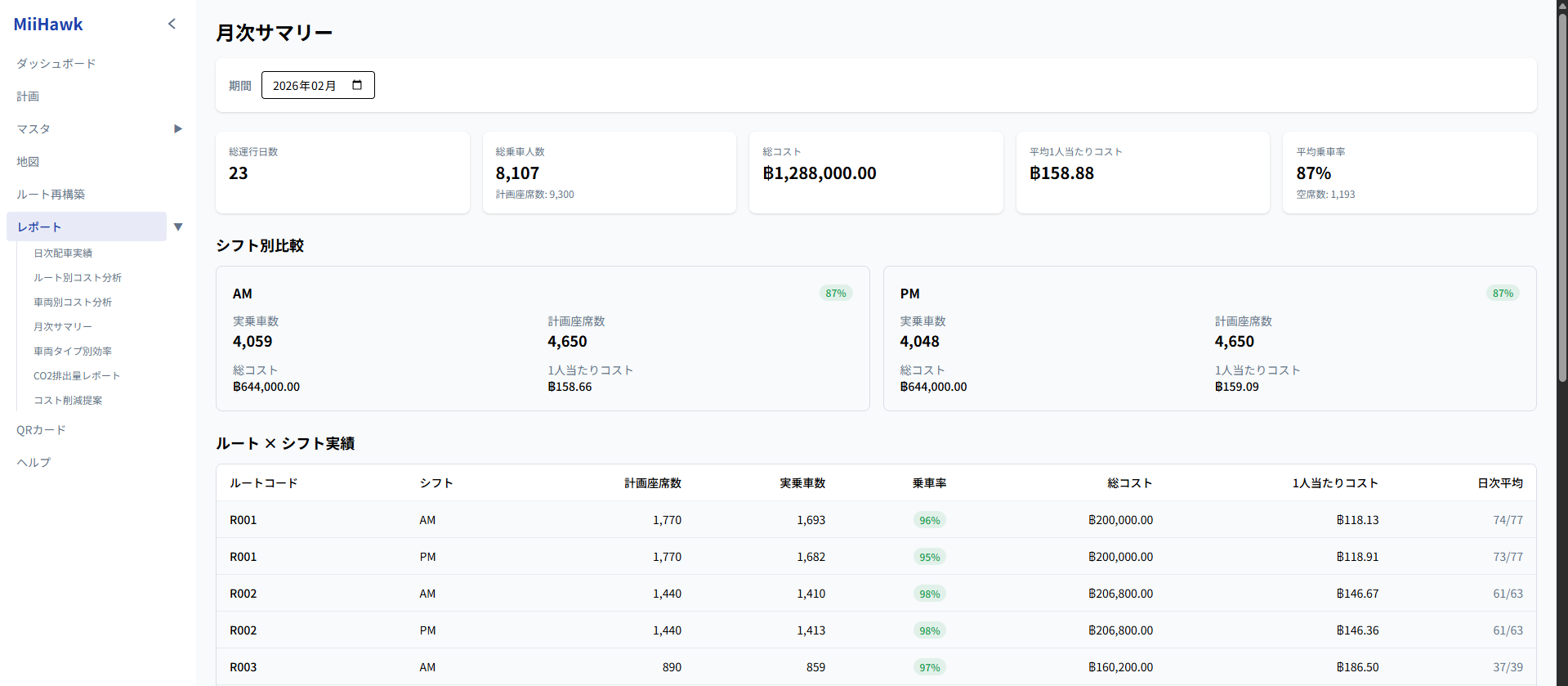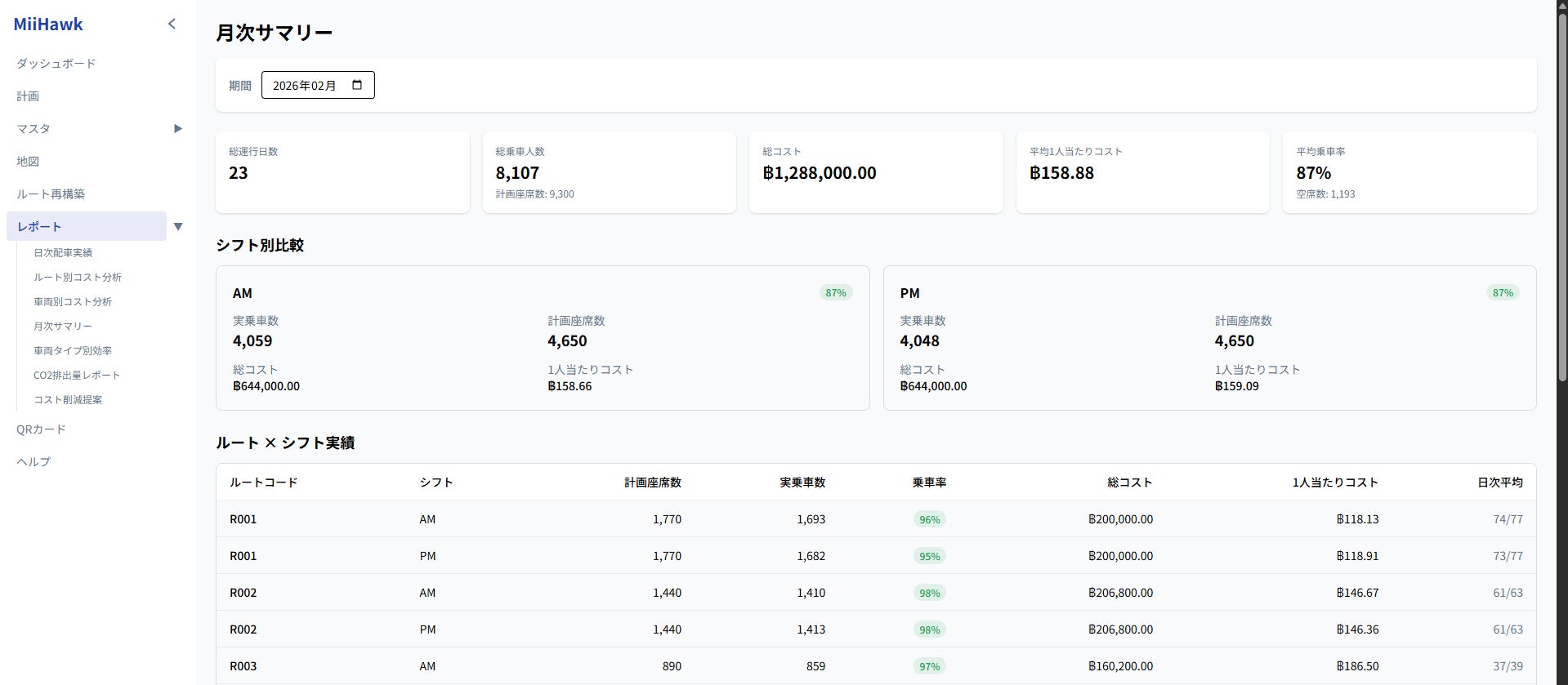 近年、AI(人工知能)を用いた最適化システムが登場していますが、「なぜその配車結果になったのか」という計算過程がブラックボックス化しやすく、現場の担当者が納得して運用できないという課題がありました。 MiiHawkは、ブラックボックス化を排除した 「最適化アルゴリズム」 を考案。乗車実績データ、シフト情報、車種ごとのコスト設定などの条件から、明確な論理的根拠に基づき「最もコスト効率の高い車種の組み合わせと便数」を瞬時に導き出します。