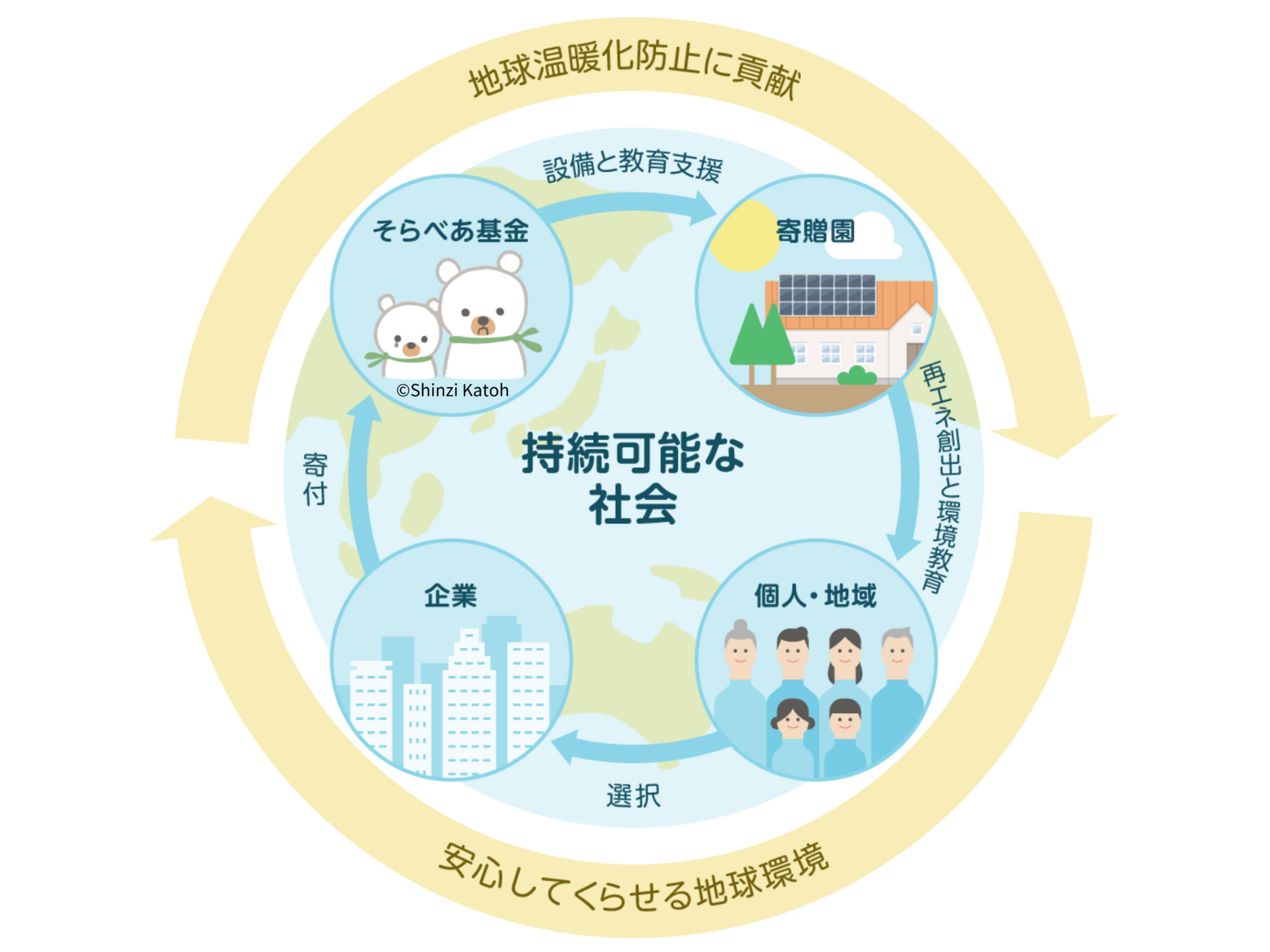特定非営利活動法人そらべあ基金(代表理事:冨田秀実、所在地:東京都港区)は、再生可能エネルギーの普及啓発と子どもたちへの環境教育を通じて、地球温暖化防止に貢献することを目的に、全国の幼稚園・保育園・子ども園へ太陽光発電設備「そらべあ発電所」(5kW相当)を無償で寄贈する「そらべあスマイルプロジェクト」を実施しています。