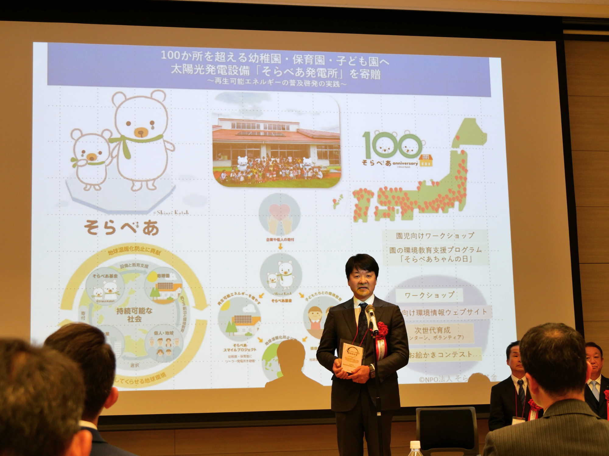 全国100か所を超える幼稚園・保育園・子ども園への太陽光発電設備の寄贈や、未来を担う子どもたちへの環境教育活動、東日本大震災後の復興支援など、長年にわたる社会貢献の実績が高く評価され、以下の2つの賞を受賞しました。
