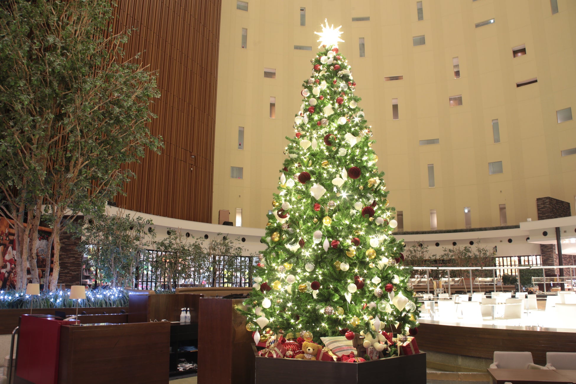 12月25日(木)までは、赤と白を基調としたクラシックなクリスマスツリーが登場。高さ約6mのツリーの足元には、プレゼントボックスやテディベア、くるみ割り人形が並び、まるで絵本のような心あたたまる光景が広がります。