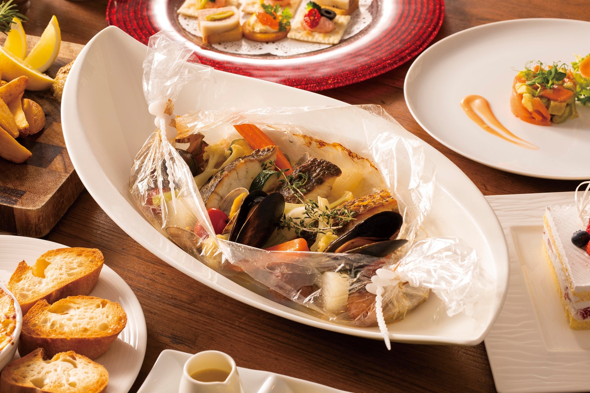 真鯛やムール貝などの魚介と季節野菜の旨みを透明なシートのカルタ・ファタで閉じこめて焼き上げたこだわりの一品です。