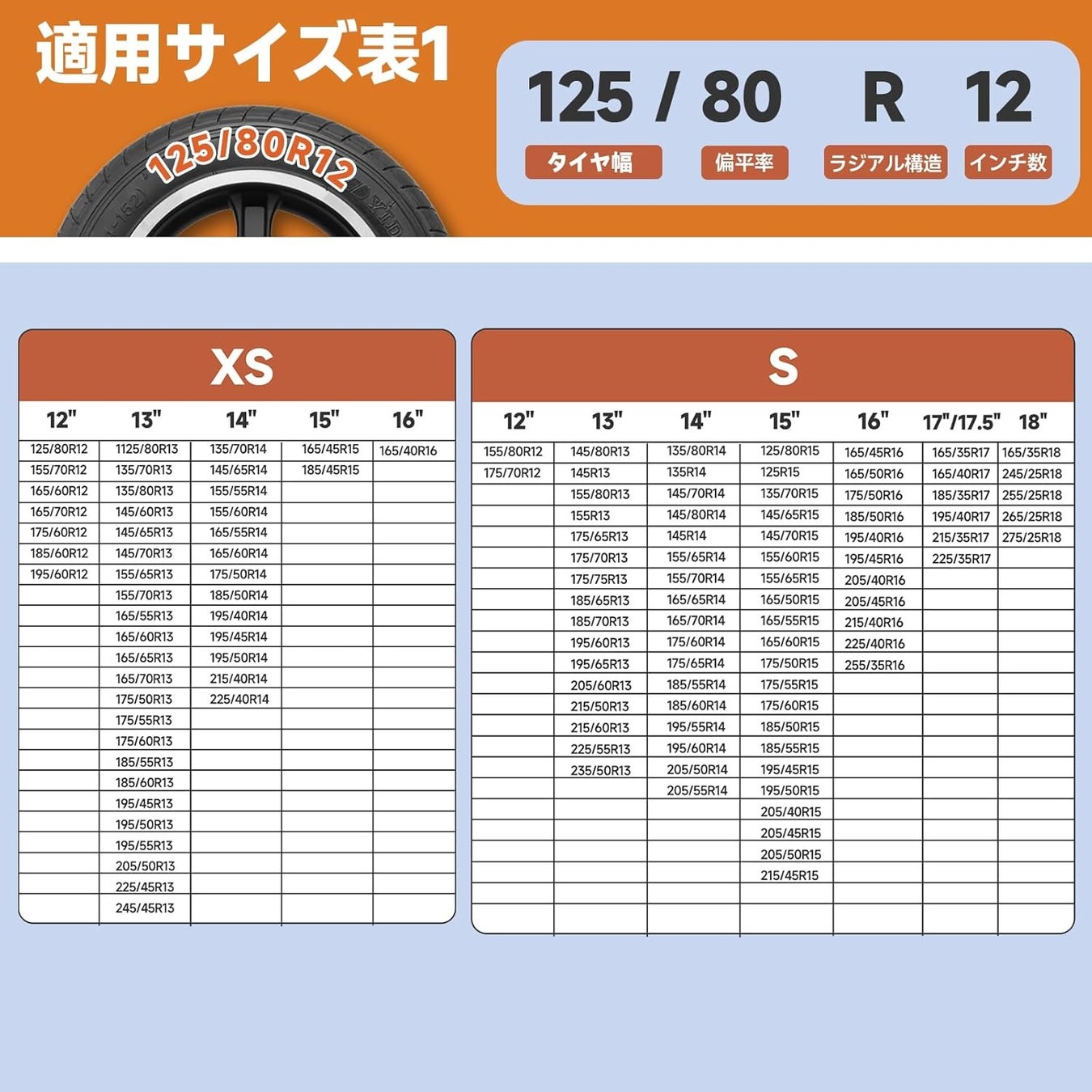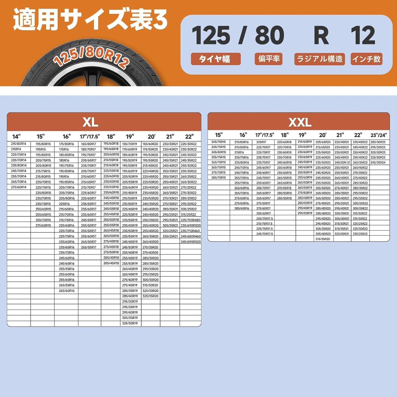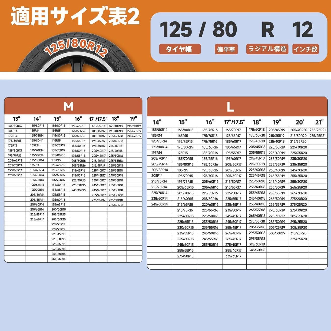 【サイズ選びは最重要】 製品詳細ページのサイズ対応表で、ご自身のタイヤサイズ(例:205/55R16) を必ず確認の上、適合するサイズをお選びください。6種類のサイズでほとんどの乗用車に対応しています。