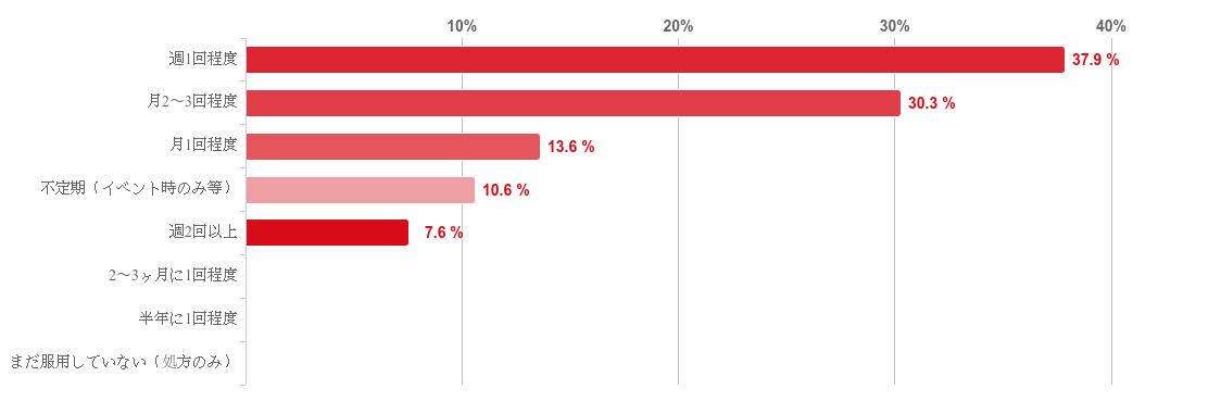 「週1回程度」と回答した人が37.9%で最も多く、次に「月2〜3回程度」との回答が30.3%、「月1回程度」が13.6%という順となった。そのほか、「不定期(イベント時のみ等)」(10.6%)や「週2回以上」(7.6%)と回答した人も少数みられた。