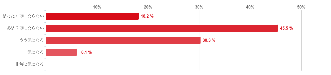 「あまり気にならない」と回答した人が45.5%で最も多く、続いて「やや気になる」との回答が30.3%、「まったく気にならない」との回答が18.2%という順となった。また、「非常に気になる」と回答した人はいなかった。