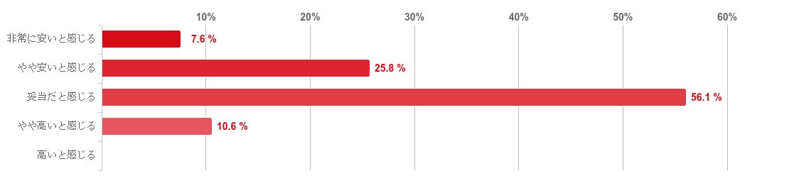 「妥当だと感じる」と回答した人が56.1%で過半数となり、次に「やや安いと感じる」との回答が25.8%で続いた。反対に、「やや高いと感じる」と回答した人は10.6%と少数で「高いと感じる」と回答した人はいなかった。