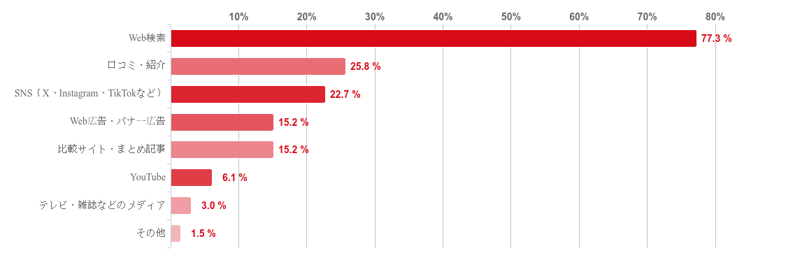「Web検索(GoogleやYahoo!など)」と回答した人が77.3%で圧倒的に多く、次いで「口コミ・知人の紹介」(25.8%)、「SNS(X、Instagram、TikTokなど)」(22.7%)と続いた。