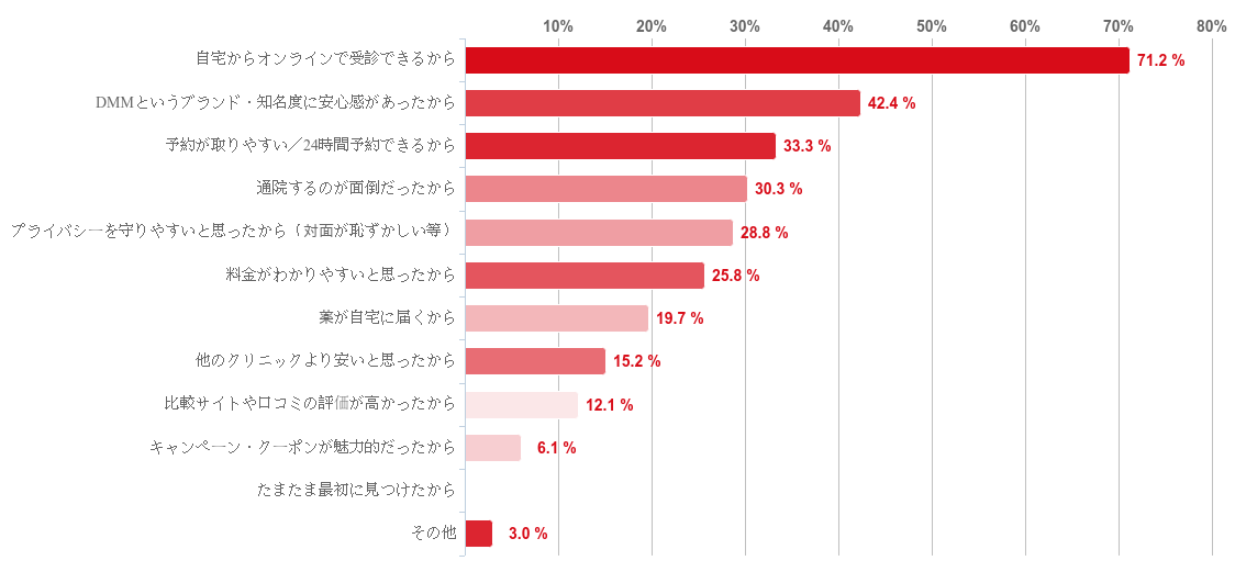 「自宅からオンラインで受診できるから」と回答した人が71.2%と最も多く、次いで「DMMというブランド・知名度に安心感があったから」との回答が42.4%、「予約が取りやすい/24時間予約できるから」が33.3%と続いた。