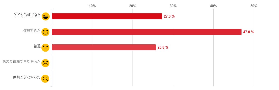 「信頼できた」と回答した人が47.0%で約5割となり最も多く、「とても信頼できた」(27.3%)との回答と合わせるとこちらも約8割の人が医師の説明や対応について「信頼できた」と感じていることがわかった。反対に、「あまり信頼できなかった」、「信頼できなかった」と回答した人はいなかった。