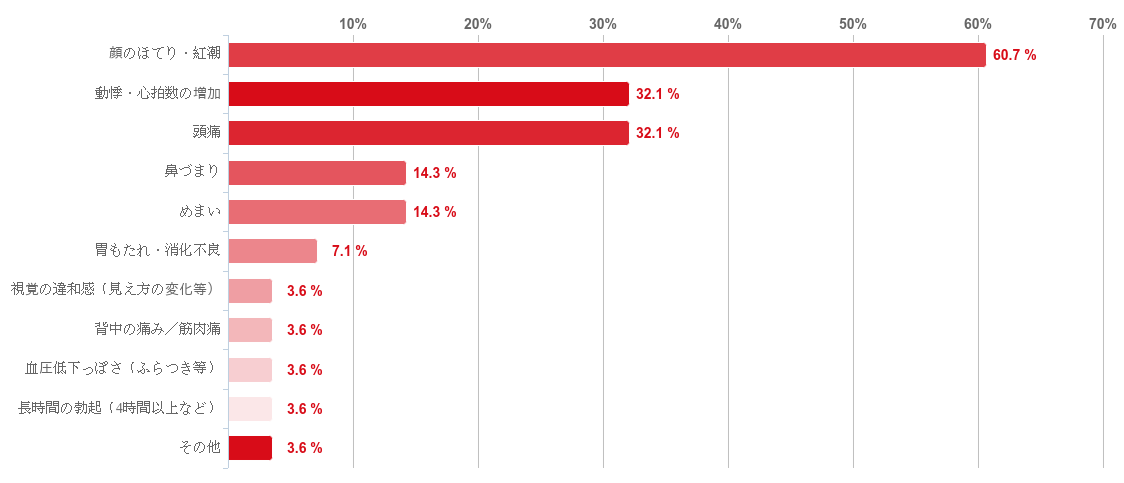 「顔のほてり・紅潮」との回答が60.7%で最も多く、「動悸・心拍数の増加」、「頭痛」との回答が共に32.1%となった。そのほか、「鼻づまり」や「めまい」、「胃もたれ・消化不良」などの回答も少数みられた。