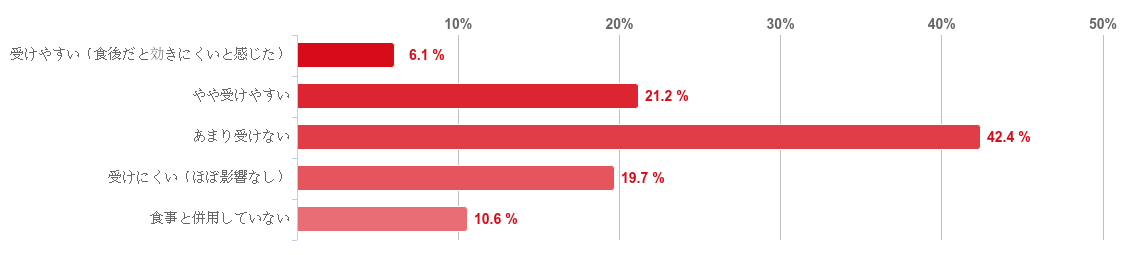「あまり受けない」と回答した人が42.4%と回答者の約4割となり、次いで、「やや受けやすい」が21.2%、「受けにくい(ほぼ影響なし)」が19.7%と続いた。また、「食事と併用していない」と回答した人も1割程度みられた。