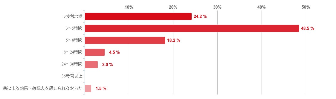 「3〜5時間」との回答が共に48.5%で最も多く、次に「3時間未満」との回答が24.2%、「5〜8時間」が18.2%となった。また、「8〜24時間」や「24〜36時間」など、8時間以上と回答した人は少数となり、多くの人が8時間以内と回答していることがわかった。
