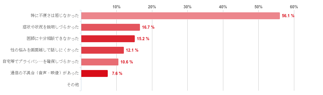 「特に不便さは感じなかった」と回答した人が56.1%で約6割となり最も多かったが、不便だと思った理由として最も多かったのが「症状や状況を説明しづらかった」(16.7%)との回答だった。そのほか、「医師に十分相談できなかった」(15.2%)や「性の悩みを画面越しで話しにくかった」(12.1%)などの回答がみられた。