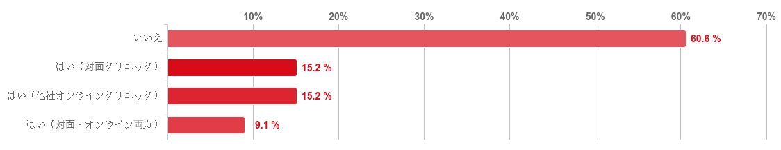 「いいえ」と回答した人が60.6%で最も多く、回答者の6割以上が、初めての利用でDMMオンラインクリニックを選んでいることがわかった。また、「はい」との回答の中では「対面クリニック」と「他社オンラインクリニック」との回答が共に15.2%、「対面・オンライン両方」との回答が9.1%となった。