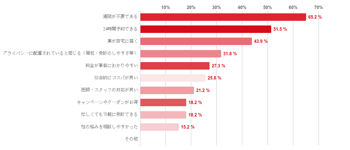 「通院が不要である」と回答した人が45.5%で最も多く、続いて「24時間予約できる」との回答が51.5%、「薬が自宅に届く」との回答が43.9%という順となった。そのほか、「プライバシーに配慮されていると感じる(梱包・受診のしやすさ等)」(31.8%)や「料金が事前にわかりやすい」(27.3%)「総合的にコスパが良い」(25.8%)と回答した人も一定数みられた。