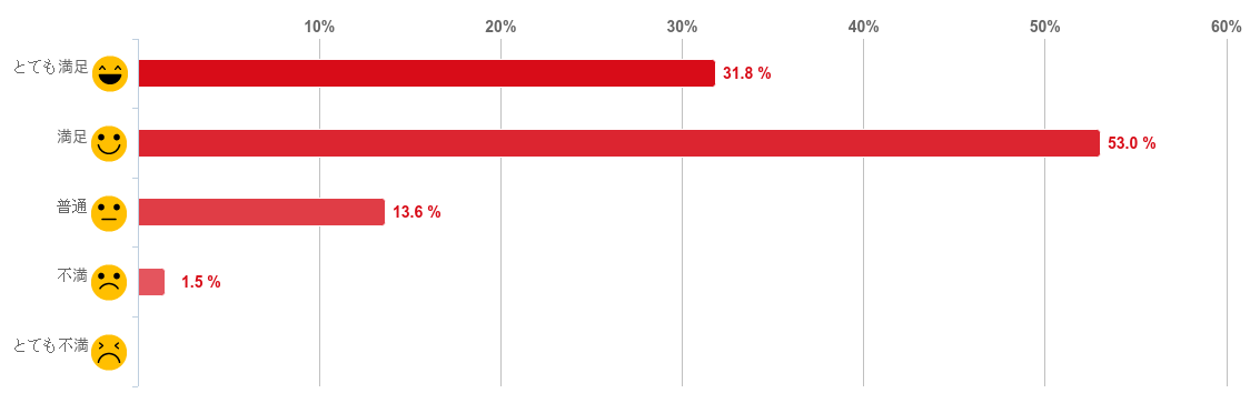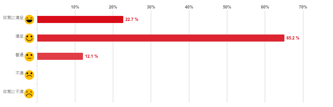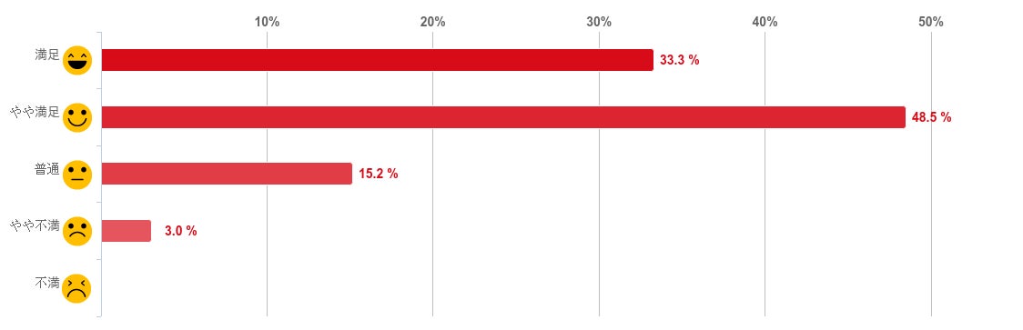 「やや満足」と回答した人が48.5%で最も多く、次に「満足」との回答が33.3%、となり、満足と感じている人が回答者全体の8割以上を占めた。反対に「やや不満」と回答した人は僅か3.0%で「不満」と回答した人はいなかった。