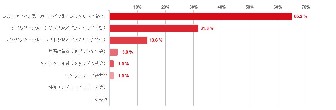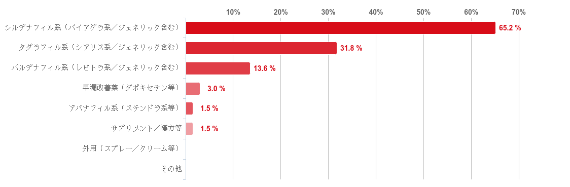 「シルデナフィル系(バイアグラ系/ジェネリック含む)」と回答した人が65.2%で最も多く、次いで「タダラフィル系(シアリス系/ジェネリック含む)」との回答が31.8%と続き、この二つの回答が多くの割合を占めた。そのほか、「バルデナフィル系(レビトラ系/ジェネリック含む)」が13.6%、「早漏改善薬(ダポキセチン等)」が3.0%で続いた。
