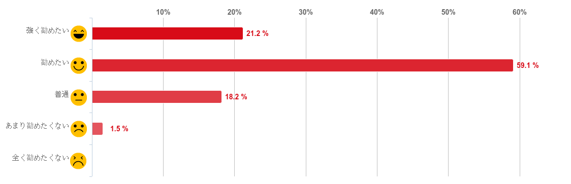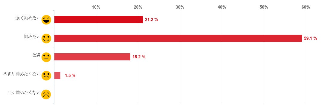 「勧めたい」と回答した人が59.1%で最も多く、次に「強く勧めたい」との回答が21.2%となり、DMMオンラインクリニックを「勧めたい」と感じている人は回答者全体の8割以上を占めた。反対に「あまり勧めたくない」や「全く勧めたくない」と回答した人はほとんどおらず、回答者の多くがED(または早漏)で悩んでいる友人や知人にDMMオンラインクリニックを「勧めたい」と感じていることがわかった。