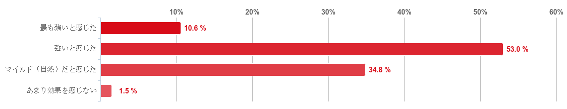 「強いと感じた」と回答した人が53.0%で最も多く、次に「マイルド(自然)だと感じた」との回答が34.8%、「最も強いと感じた」との回答が10.6%となった。また、「あまり効果を感じない」との回答した人はほとんどいなかった。