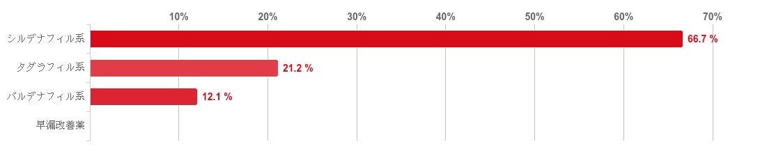 「シルデナフィル系」と回答した人が66.7%で圧倒的に多く、次いで「タダラフィル系」との回答が21.2%、「バルデナフィル系」が12.1%と続いた。また、「早漏改善薬」と回答した人はいなかった。