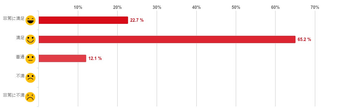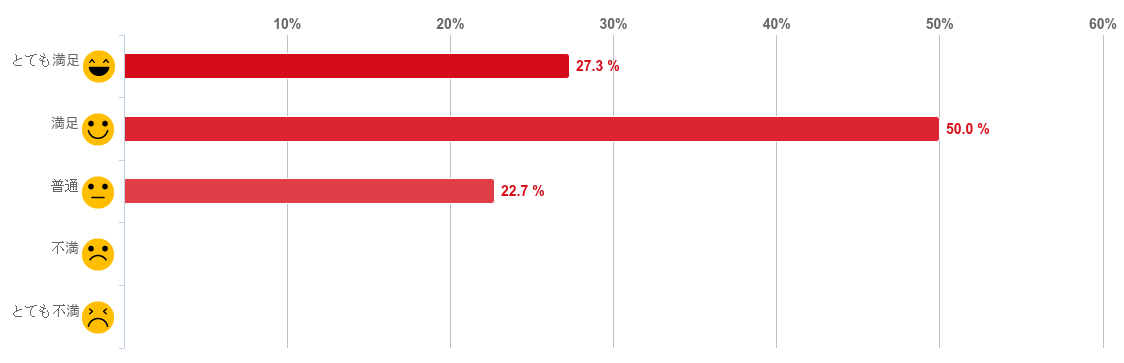 「満足」と回答した人が50.0%で最も多く、「とても満足」(27.3%)との回答と合わせると約8割の人が満足していることがわかった。反対に、「不満」や「とても不満」と回答した人はいなかった。