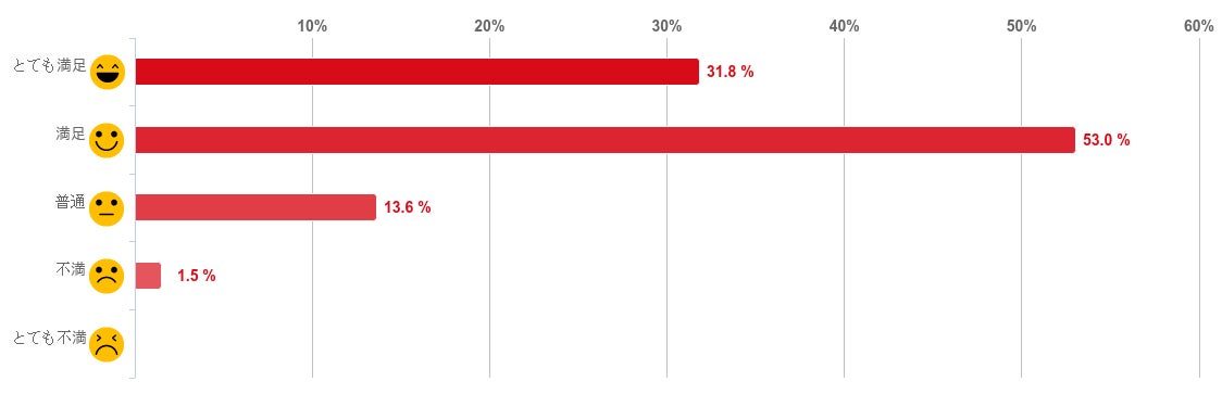 「満足」と回答した人が53.0%で過半数となり最も多く、次に「とても満足」が31.8%、「普通」が13.6%という順となった。また、「不満」と回答した人は1.5%と僅かとなり、「とても不満」と回答した人はおらず、診療予約のしやすさについて満足している人が多いことがわかった。