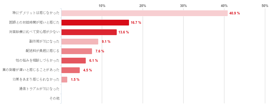 「特にデメリットは感じなかった」と回答した人が40.9%で最も多かったものの、デメリットだと感じた点として、「医師との対話時間が短いと感じた」との回答が16.7%で最も多く、次いで「対面診療に比べて安心感が少ない」との回答が13.6%「副作用が気になった」との回答が9.1%という順となった。そのほか、「配送料が負担に感じる」や「性の悩みを相談しづらかった」などの回答も僅かにみられた。