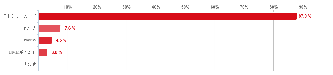 「クレジットカード」と回答した人が87.9%で圧倒的に多く、ほとんどの人がクレジットカードで支払いをしていることがわかった。そのほか「代引き」「PayPay」「DMMポイント」と回答した人はそれぞれ1割未満と僅かだった。