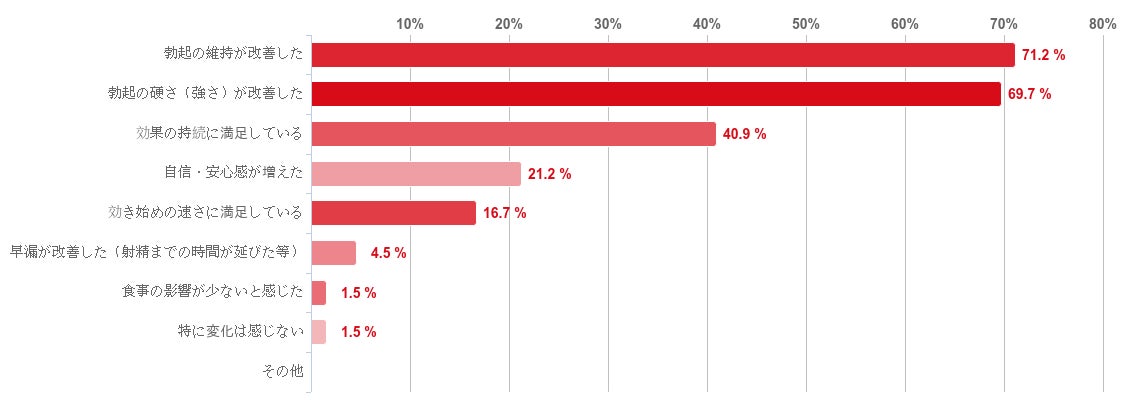 「勃起の維持が改善した」と回答した人が71.2%で最も多く、次いで「勃起の硬さ(強さ)が改善した」との回答が69.7%で続いた。そのほか、「効果の持続に満足している」と回答した人が40.9%、「自信・安心感が増えた」との回答が21.2%とという順となった。
