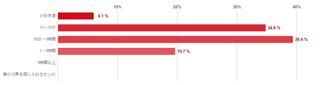 「30分〜1時間」と回答した人が39.4%で最も多く、「15〜30分」との回答が34.8%と僅差で続いた。また、「1〜3時間」(19.7%)や「15分未満」(6.1%)との回答もみられたが、「3時間以上」や「薬の効果を感じられなかった」と回答した人はいなかった。