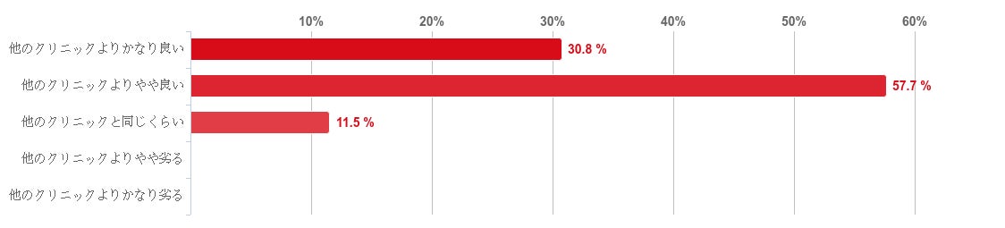 「他のクリニックよりやや良い」と回答した人が57.7%と最も多く、次いで「他のクリニックよりかなり良い」との回答が30.8%、「他のクリニックと同じくらい」との回答が11.5%と続いた。また、「他のクリニックよりやや劣る」や「他のクリニックよりかなり劣る」と回答した人はいなかった。