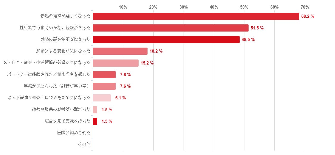「勃起の維持が難しくなった」と回答した人が68.2%と約7割を占めた。続いて「性行為でうまくいかない経験があった」との回答が51.5%、「勃起の硬さが不安になった」との回答が48.5%という順となった。