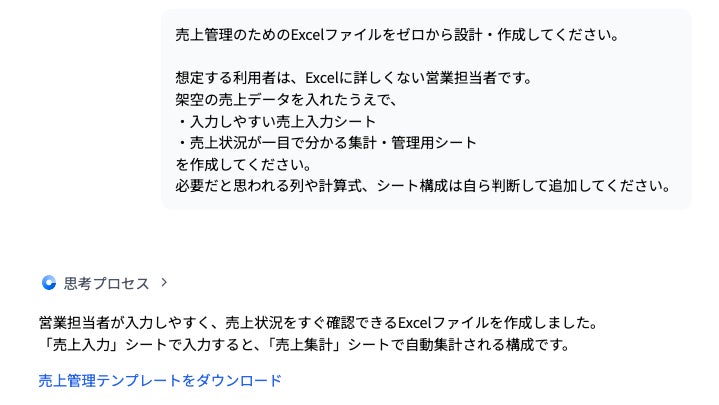 複数のデータや資料をもとにした集計表や管理表の作成、分析用シートの生成、定型フォーマットへのデータ整理などをAIが実行します。
