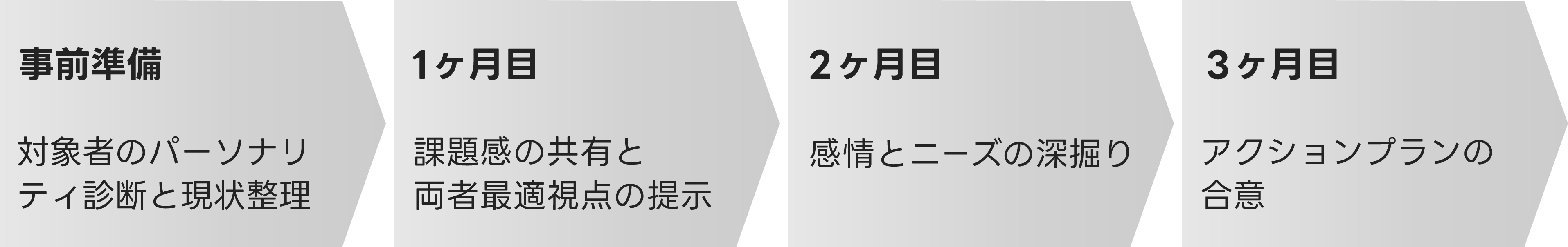 キーマン連携強化の標準ステップを解説します。キーマン2名に当社コンサルタントが伴走する「3者対話」を軸に、率直な議論と合意形成を促進します。コンサルタントが介入することで、対象者のパーソナリティーに寄り添いながら、客観的で新たな気づきを提供します。具体的なプログラム内容は、毎月の「3者対話」と「個別フォロー面談」にて構成されています。