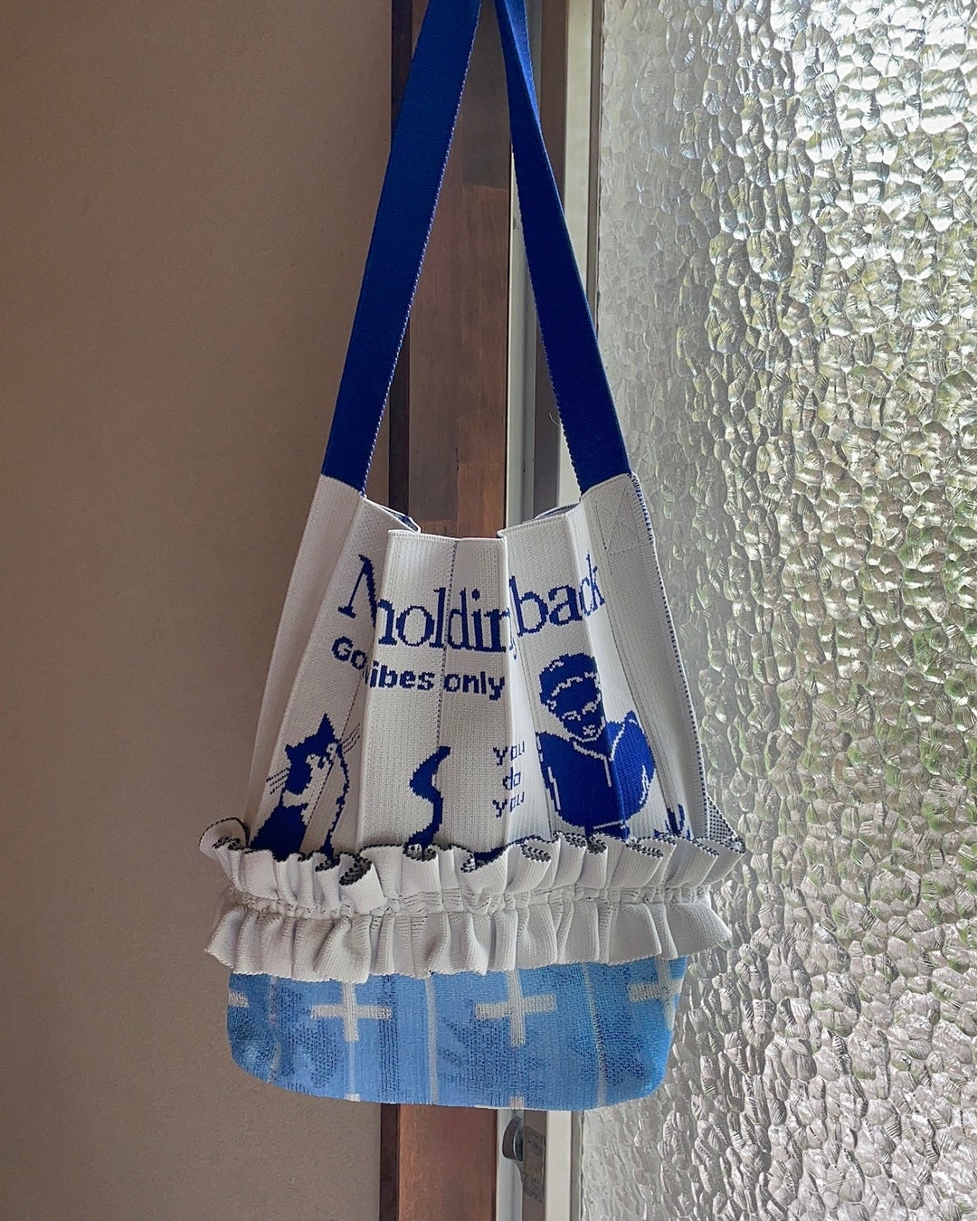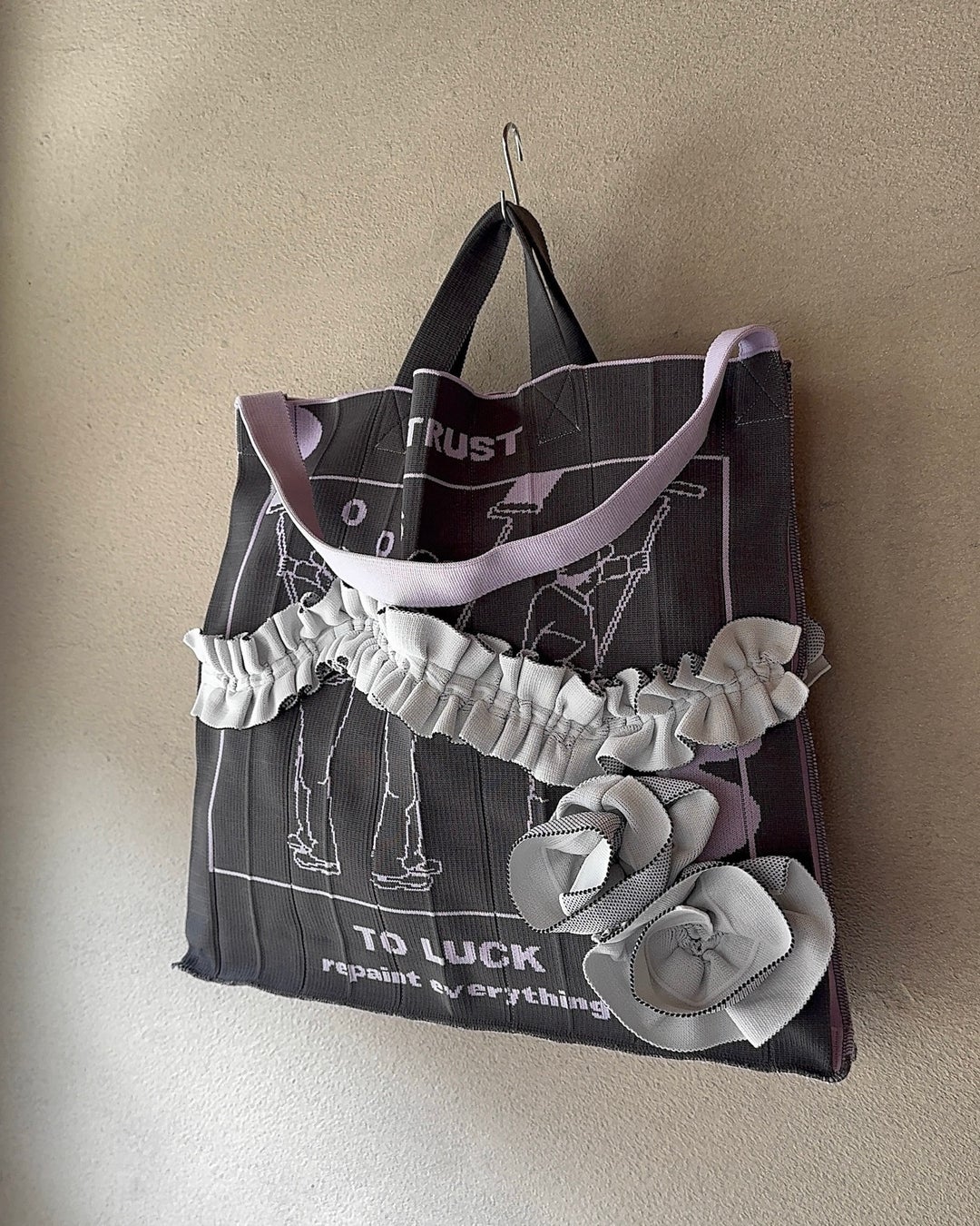 KNT365の代表的なバック、「Knitty」でも編地をふんだんに使用したアップサイクル作品が展開。
