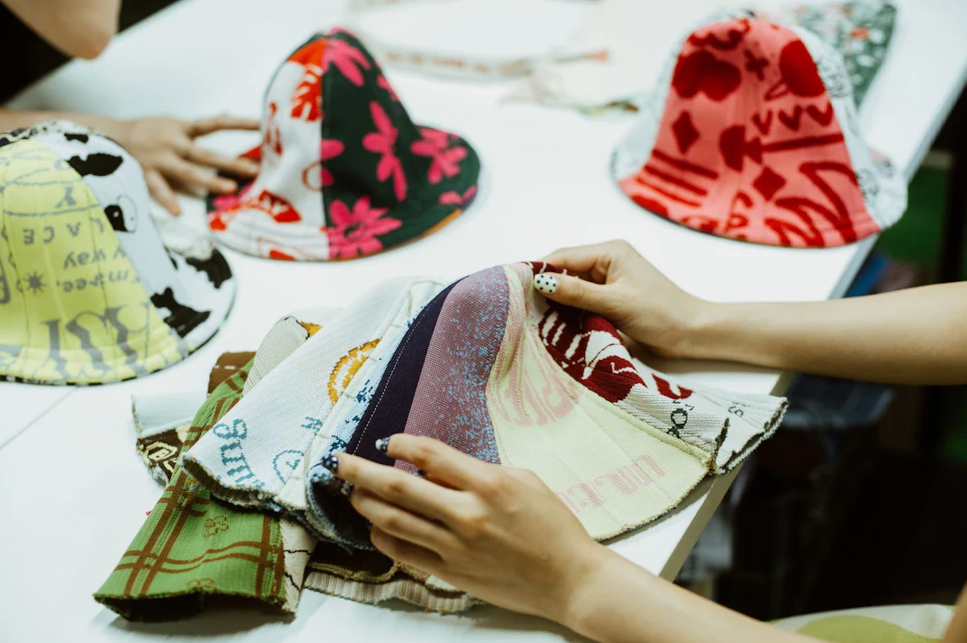 9月30日にオープンしたKNT365の旗艦店「THE KNT365 HOUSE」に登場。どうしても作品として届けることができなかった素材をアップサイクルしたバッグやハットを展開。