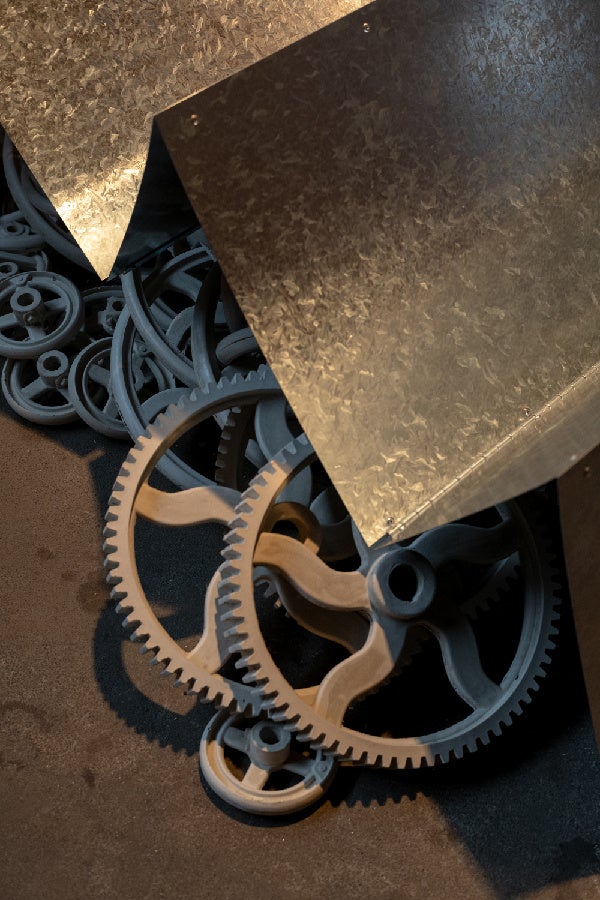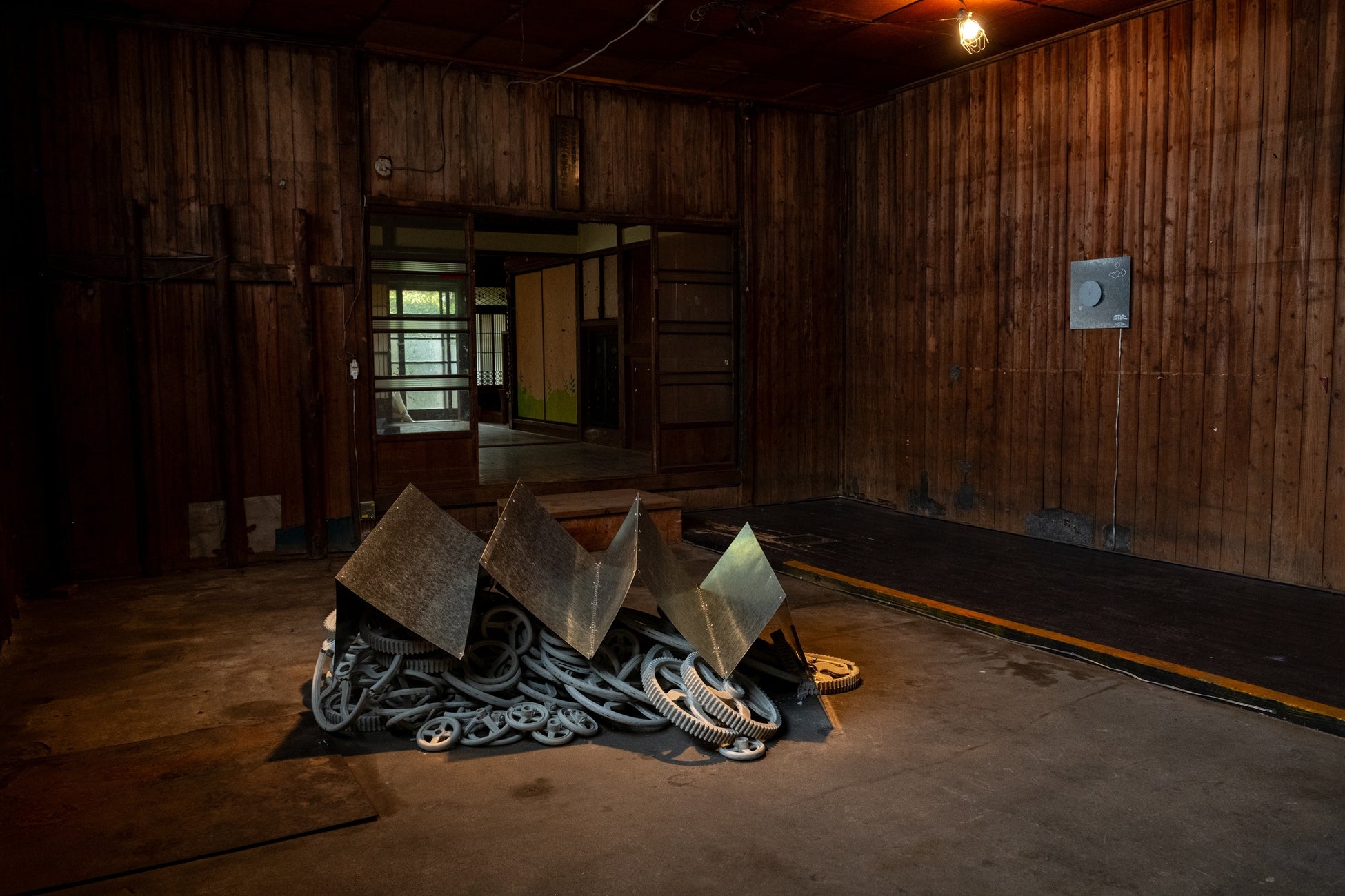 かつて織物産業によって「絹の都」と呼ばれた八王子は、戦時下に工場の転用や、空襲の被害を経験し、その痕跡は今も地域の景観に残されている。本作は、実際に市内で使われていた力織機の部品を複製し、八王子の産業を象徴する工場建築である鋸屋根の形態と重ね合わせた彫刻作品を中心に構成したインスタレーションである。交通や輸送を象徴する車輪や工場の機械部品に共通する“回転”のイメージを手がかりに、街の風景に積み重なった記憶の断片を呼び起こし、想像でしか届かない過去の風景を今ここにいる自分の実感へと結び直す。(石﨑朝子)