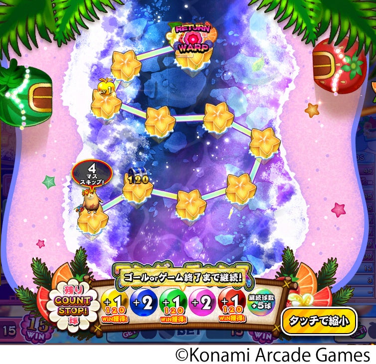 他にも、新たに「ゴーゴートレジャー」と「キャンディクランチ」の2種類のゲームが追加され、全14種類のゲームで遊べるようになりました。「ワンダーチャンス」や「すごろくチャレンジ」には新要素が加わり、⾊鮮やかなトロピカルリゾートを舞台に、より多彩なゲーム体験をお楽しみいただけます。