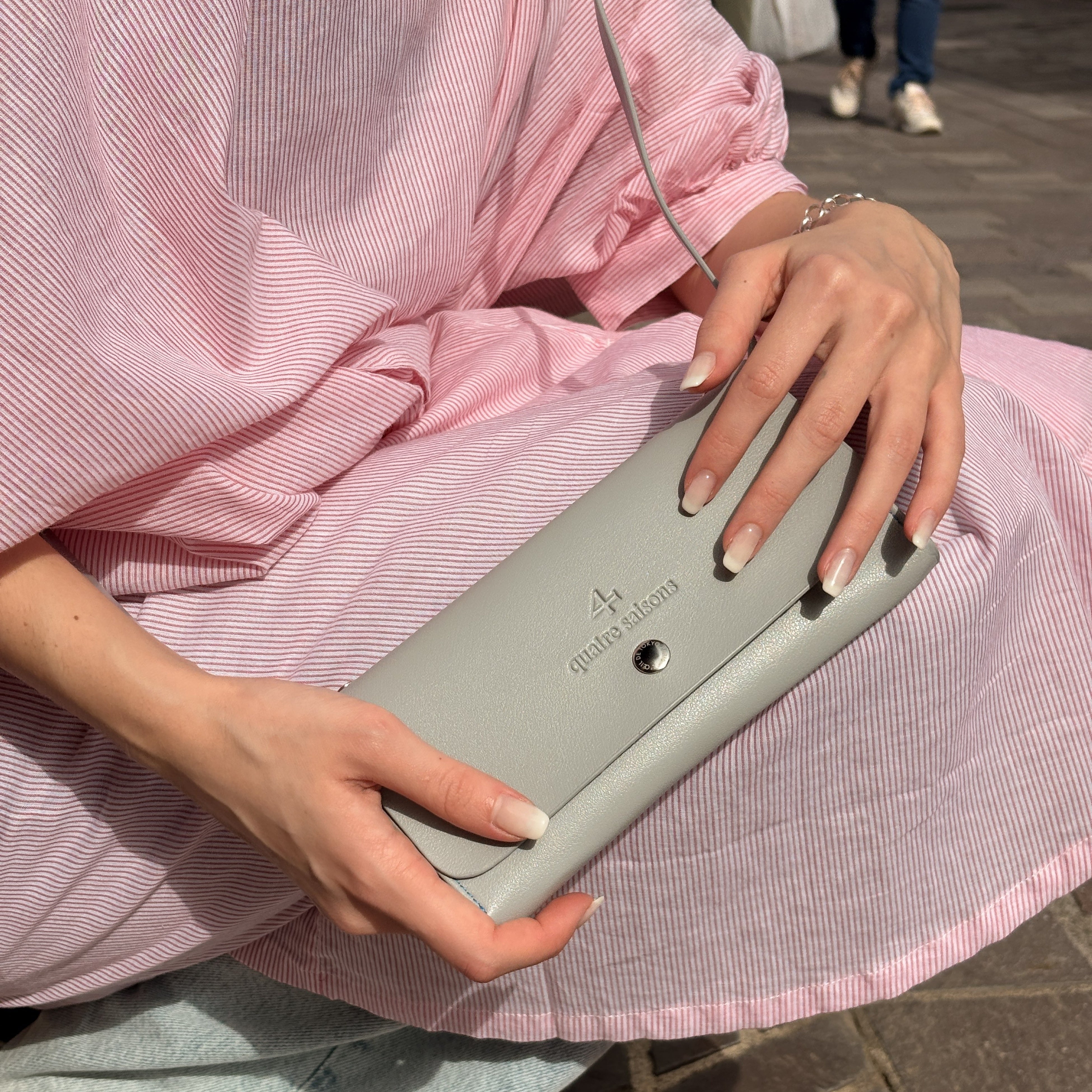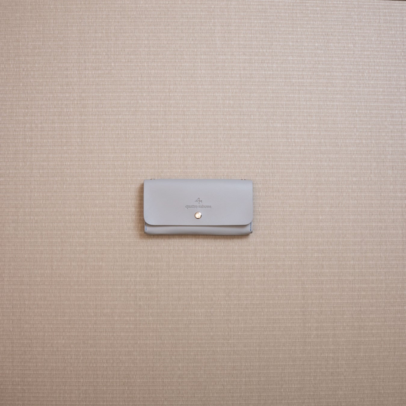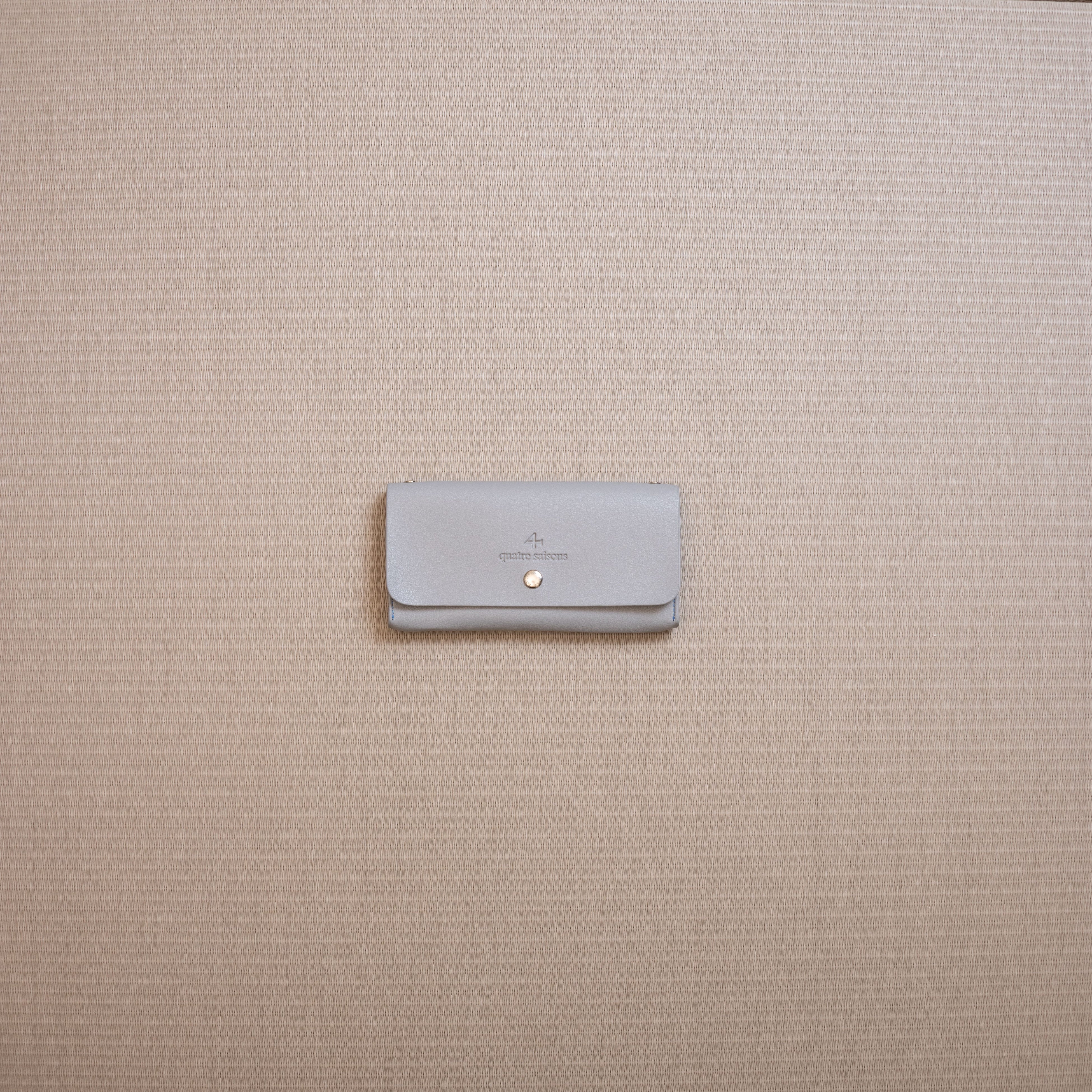 アクセントとして、ライトグレーのボディにキャトル・セゾンSSテーマ「Paris bleu」のテーマカラーのライトブルーのステッチ、フラップ部分のキャトルセゾンの刻印、