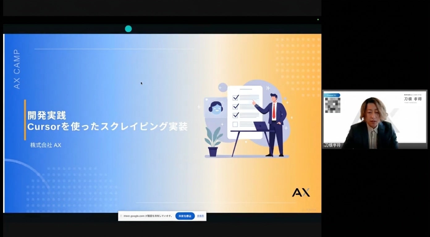本勉強会では、実例に則したウェブサイトのスクレイピングをCursor(コードエディタ)を使って実演・解説。AIを用いたバイブコーディングの方法・エラーが出た時の対処法といった実際の開発の様子をお届けしました。