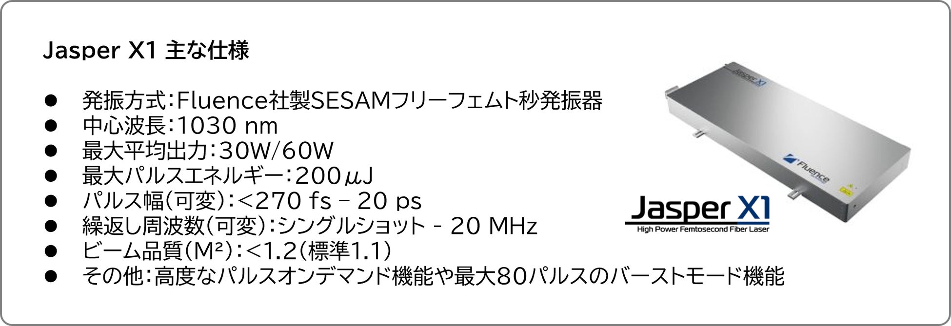 今回、当社が主力製品として販売を進めるJasper X1は、Fluence社のフェムト秒レーザ技術を基盤とした高出力フェムト秒ファイバーレーザであり、微細加工および研究開発用途向けに最適化されたモデルです。