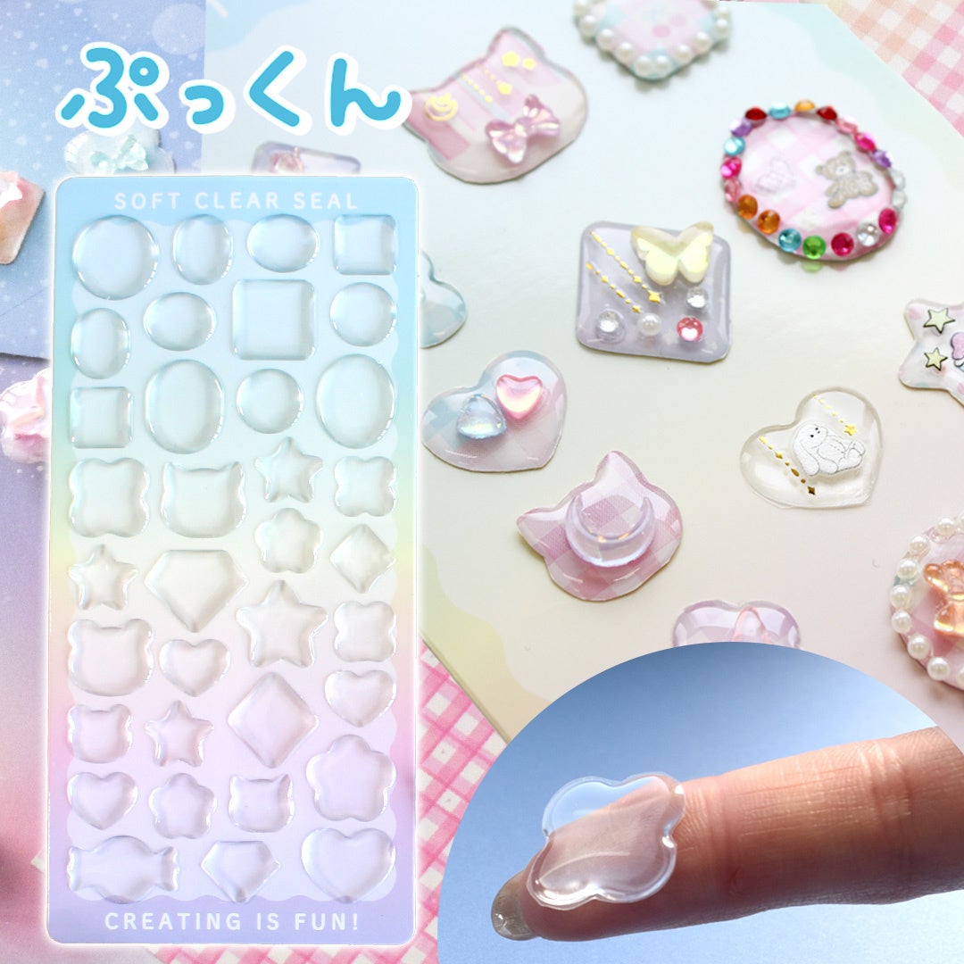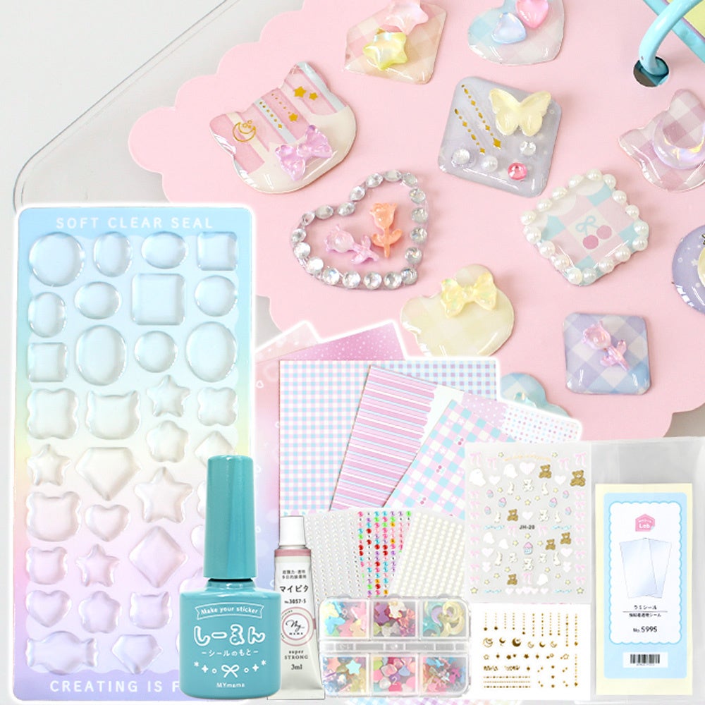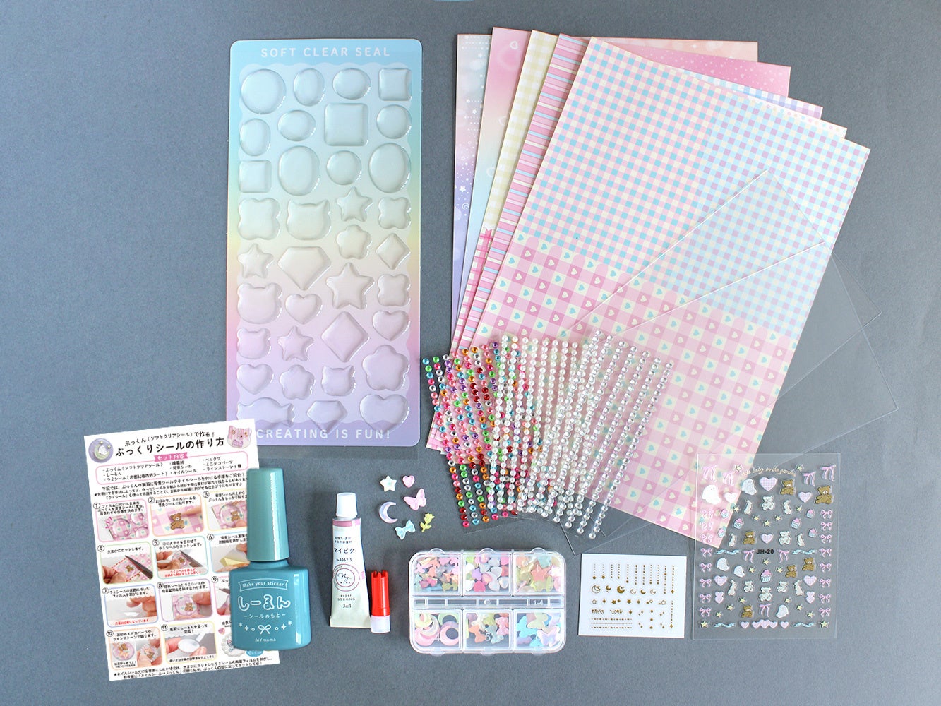 デコレーション素材を上から重ねるだけで、誰でも簡単にぷっくりシールを作ることができます。