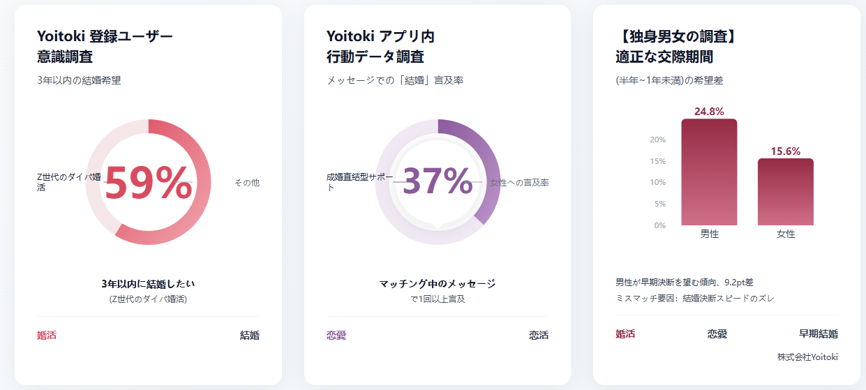 本調査結果および公的機関の統計データを分析した結果、社会全体における平均初婚年齢や平均交際期間と、20代後半の独身男女が実際の婚活において希望する結婚年齢・交際期間の間に乖離があることが確認されました。株式会社Yoitokiは、この多様化する結婚観から生じる「結婚希望時期と交際期間のミスマッチ」という課題に対応するため、自社が運営するマッチングアプリ「Yoitoki」において、結婚までの希望期間を基準とした仕様変更および機能強化を実施したことをご報告いたします。