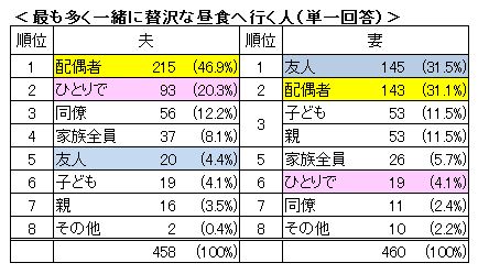 - 贅沢な昼食へ最も多く一緒に行くお相手は?夫はダントツ「配偶者」(46.9%)、妻は僅差で「友人」(31.5%)がトップに。「配偶者」と答えた人ほど夫婦関係は「良好」である傾向。