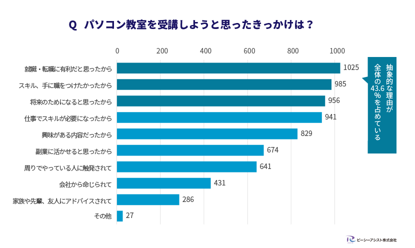 2年以内に有料のパソコンスクール or パソコン教室を受講し、卒業(修了)した経験のある方にパソコン教室の受講のきっかけについて質問したところ、1位 「就職・転職に有利(1,025名)」 2位「将来のため(985名)」 3位 「スキル、手に職をつけたいと思ったから(956名)」 など曖昧ともいえる、抽象的な要因が全体の43.6%を占め、「仕事でスキルが必要になったから」「興味がある内容だったから」といった明確かつ具体的な理由よりも多い結果となりました。