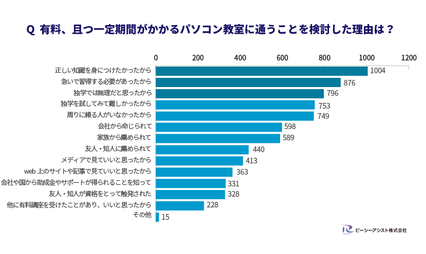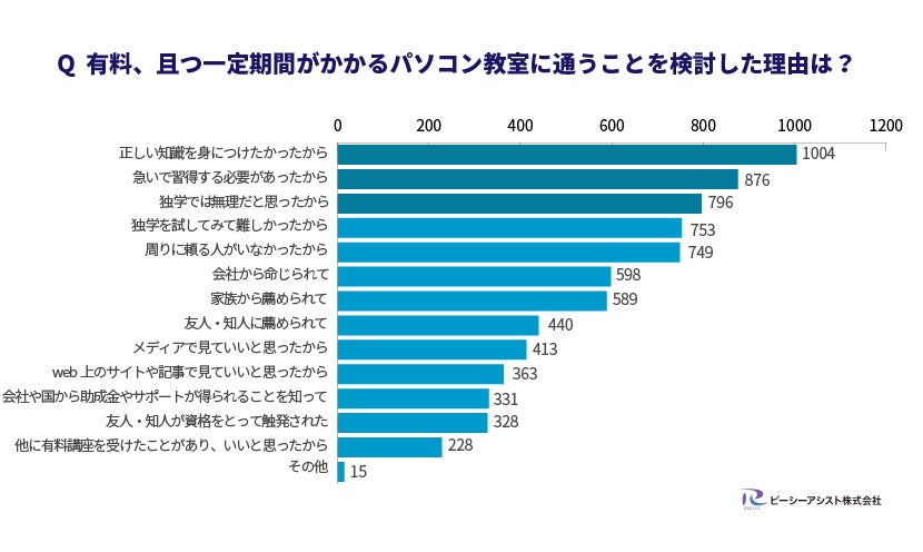 YouTubeやWebサービス等無料もしくは低価格で学べる環境が手に入りやすい現在、なぜ有料かつ一定の受講期間を必要とするパソコン教室を受講しようと思ったのか聞いてみたところ、1位「正しい知識を身につけたかった(1,004名)」が突出して多く、2位「急いで習得する必要があった(876名)」、3位「独学では無理と思った(796名)」と続く結果になりました。