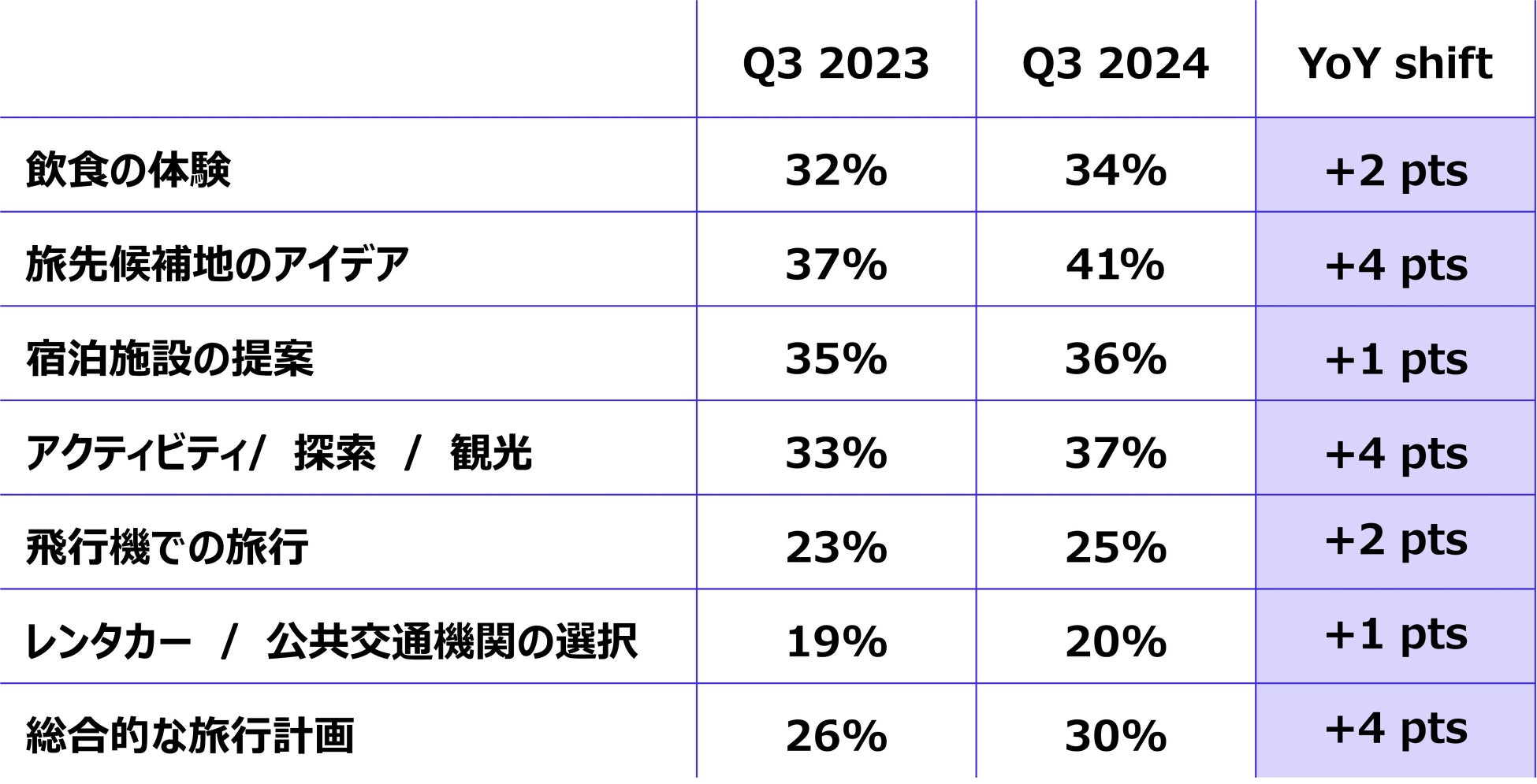 調査の結果、旅行者はインスピレーションを求めオンラインで情報を探すことが多くなり、旅行検索に AI ツールの活用度合いが高まっていることが明らかになりました。このトレンドは、良い旅行にするために必要なものをより簡単に予約することができるようになるなど、これまで以上にテクノロジーとイノベーションが世界を探求する人々の旅行のあり方を決める上で重要になってくるという新しい時代の到来を示しています。
