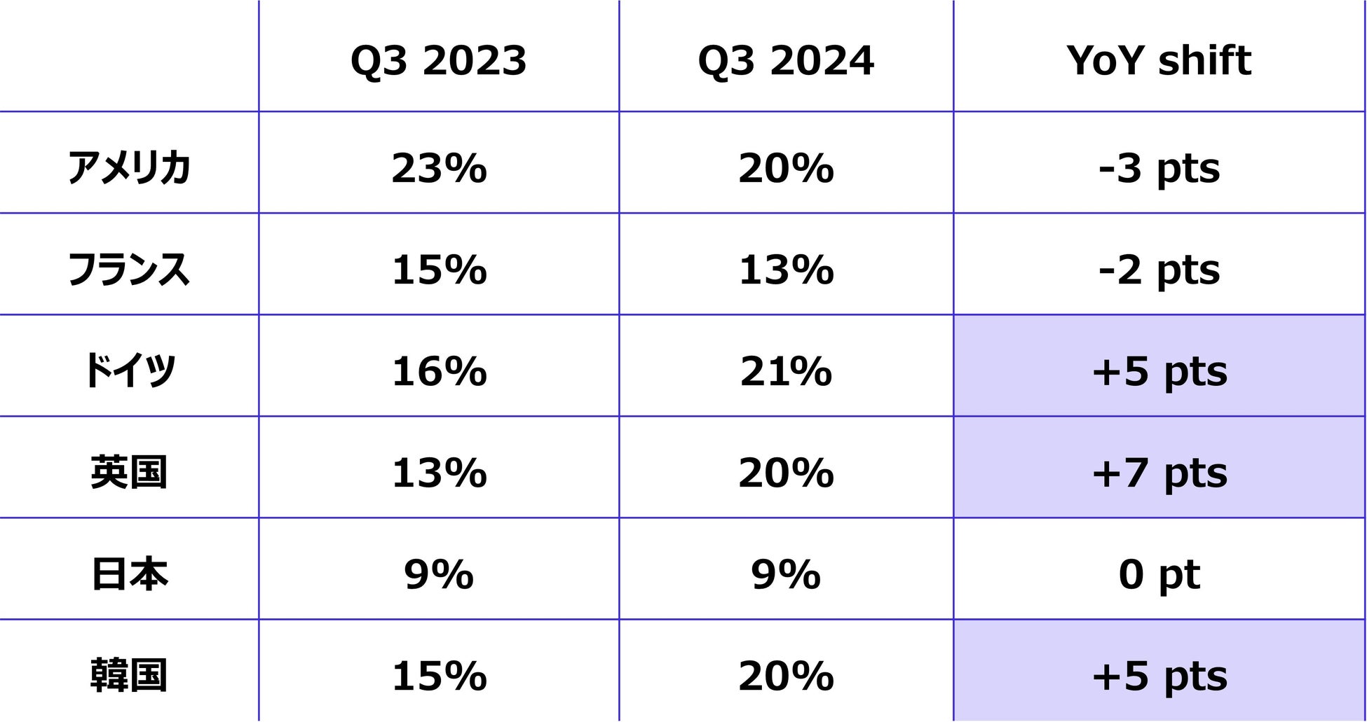 *2023 年 4 月から 2024 年 3 月までの安定したデータを持つグローバル小売業者と旅行プロバイダーで、縦軸の数値は独立しており、相対的な価値や量を表すものではありません。