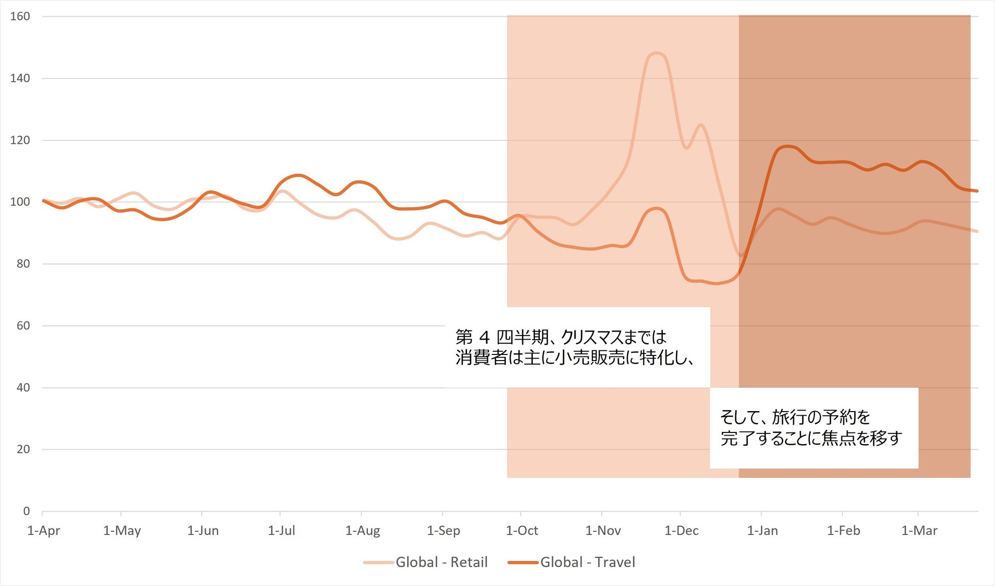 消費者の旅行計画はクリスマス以降、新年から活発化:消費者の関心は、特定の期間(夏のバケーションシーズン、年末のホリデー ショッピング時期や新年以降)に、買い物から旅行予約へと大きく移行。通常、予約確定までに約 2 週間かかる点と、また、1 月の旅行予約数が急増する点を考慮すると、旅行業界では 12 月から顧客争奪戦が繰り広げられることが必須。