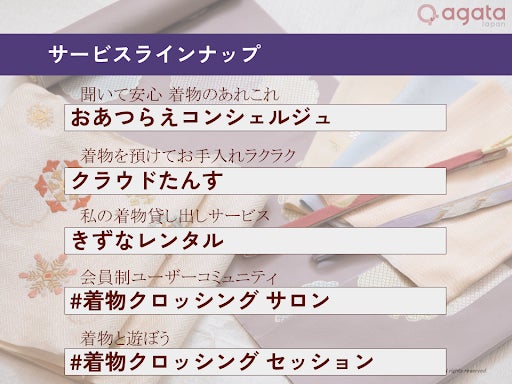 呉服の老舗 丁子屋とコラボし、着物クロッシングというブランドを立ち上げ、「キモノをキラクに」をテーマに、着物のお預かりサービス「クラウドたんす」高級着物のシェアリングサービス「きずなレンタル」を立ち上げました。